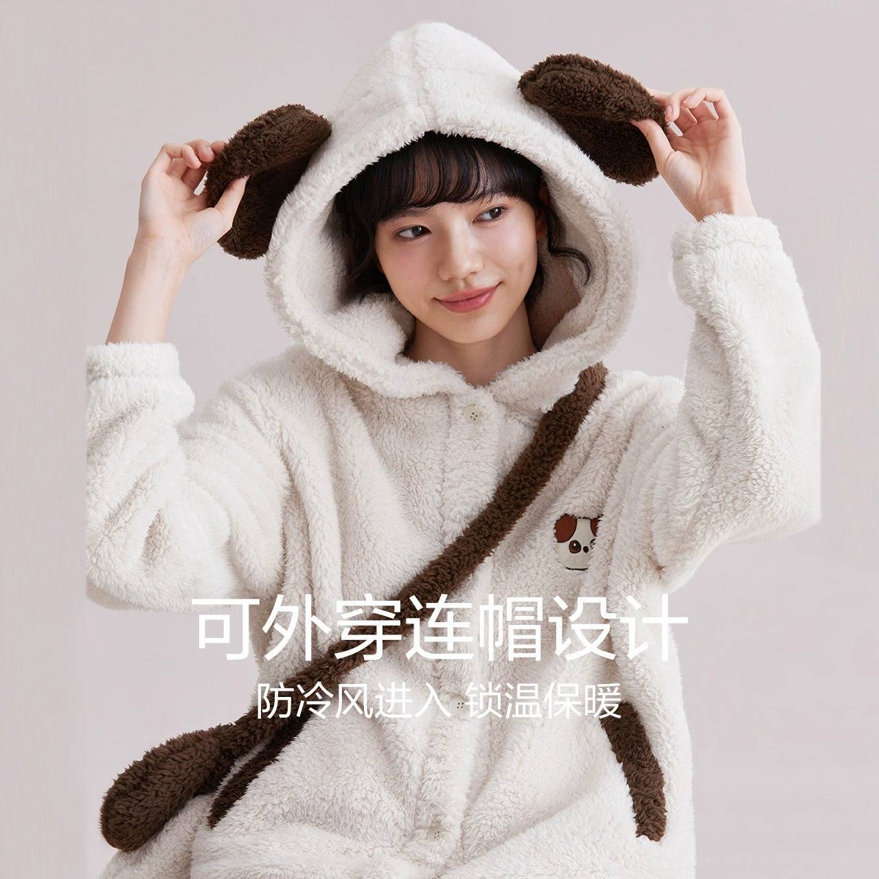 ? 立体剪裁:宽松版型设计,活动自如不紧绷,适合各种体型的人群。? 可外穿设计:时尚的连帽款式和可爱的小熊图案,下楼取快递也不失体面。? 抑菌处理:特殊工艺处理的面料能有效抑制细菌滋生,长时间穿着也不会有异味。