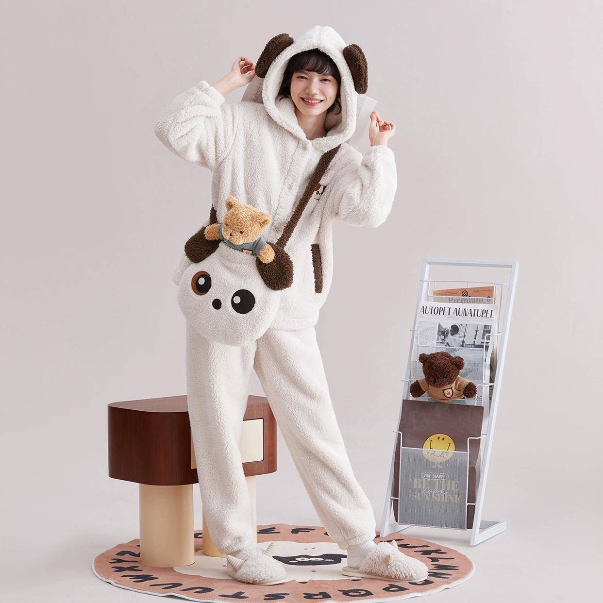 红豆保暖睡衣套装珊瑚绒少女可外穿连帽秋冬季家居服加厚可爱小熊
